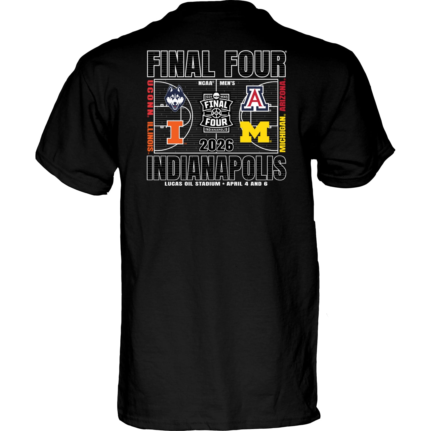 Celebrate your favorite Men's Basketball team making the Final Four with this lightweight black court t-shirt, featuring all of the Final Four team logos.